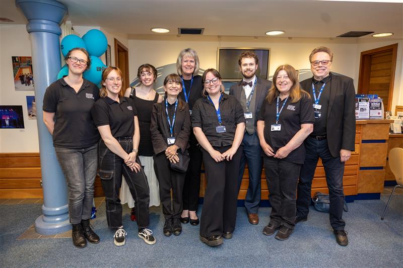 From left to right: Imogen Tong (Theatre Outreach Manager), Sammie Horton (Drama Assistant and Director in Residence), Evie Bryson (Technical Assistant), Katie Neville (Duty Manager), Elizabeth Capewell (Front of House Assistant), Sarah Robinson (Theatre Administration Manager), Alex Kaniewski (Duty Manager). Lyn Moore, (Box Office Assistant), Peter Jordan (Front of House Assistant).